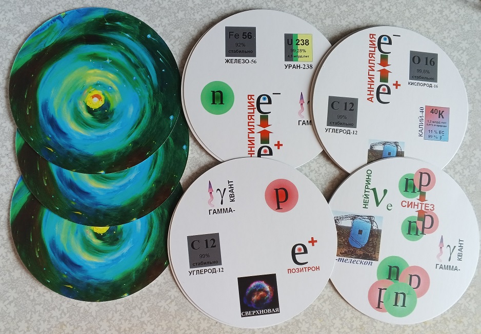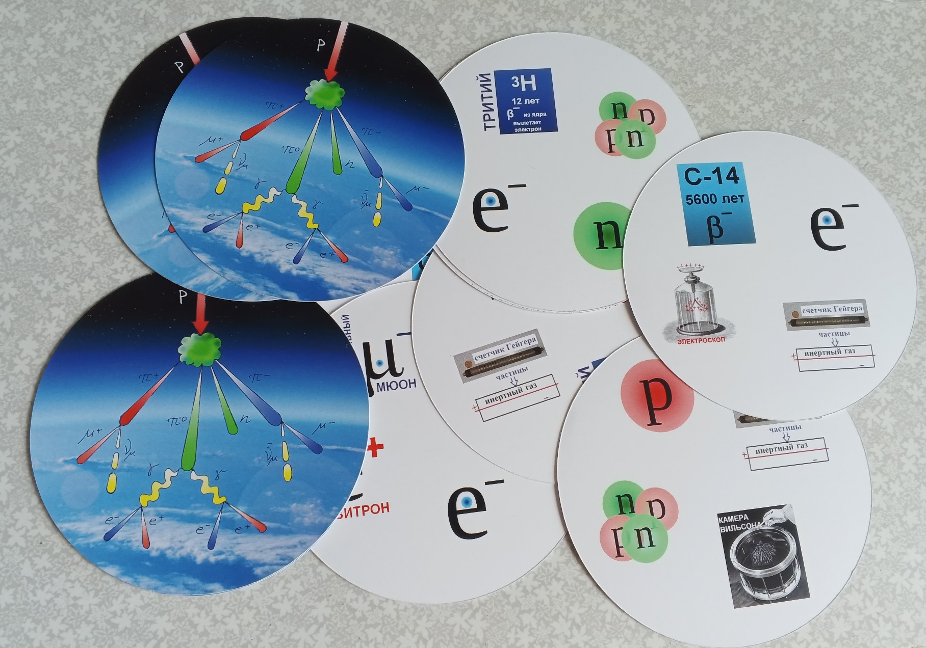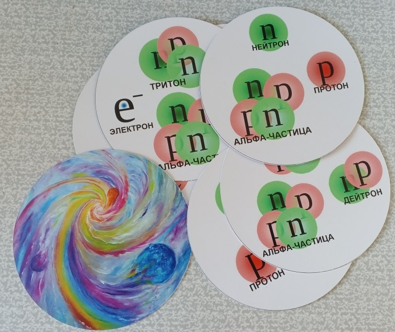 Если Вы находите одинаковый объект и НАЗЫВАЕТЕ его, то выигрываете карточку из общей стопки. Игра используется в образовании: уровень 1 В первые минуты жизни Вселенной из протонов и нейтронов формировались ядра вплоть до лития И, простите за жульничество, протоны и нейтроны — не шарики (у электрона пока вообще размер не обнаружен; считается точечным). Частицы лучше описываются не формой и окраской, а уравнениями. карточки